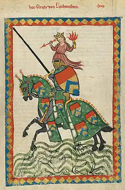 Legally, a ministerial was a ministerial, bound by the rights and duties enumerated in their area. Socially, there was a distinction between the greater ministerials and the lesser ones in the order of precedence.[20] Greater ministerials maintained their own subordinate milites, or armigerous soldiery. These could be either free knights (such as Werner of Bolland, who maintained 1,100 subordinate knights for Frederick Barbarossa) or lesser ministerials like the wealthy widow Diemut von Högl, who held four castles with ministerial chaplain, chamberlain and seneschal.[21] The lesser ministerials were ones who held no subordinates at all, but rather held an office and may or may not have maintained arms and armor.[22]