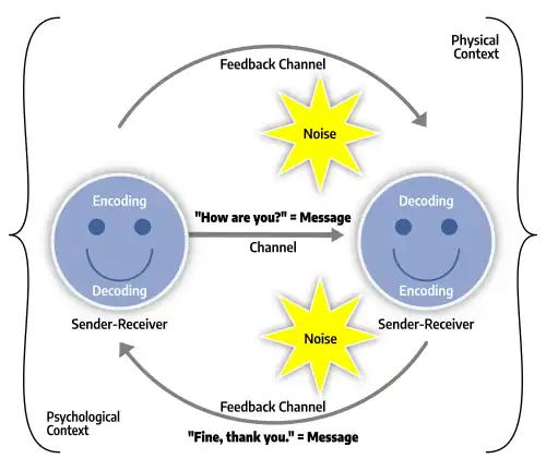 For interaction models, these steps happen one after the other: first, one message is sent and received, later another message is returned as feedback, etc. Such feedback loops make it possible for the sender to assess whether their message was received and had the intended effect or whether it was distorted by noise.[29] For example, interaction models can be used to describe a conversation through instant messaging: the sender sends a message and then has to wait for the receiver to react. Another example is a question/answer session where one person asks a question and then waits for another person to answer. Interaction models usually put more emphasis on the interactive process and less on the technical problem of how the message is conveyed at each step. For this reason, more prominence is given to the context that shapes the exchange of messages. This includes the physical context, like the distance between the speakers, and the psychological context, which includes mental and emotional factors like stress and anxiety.[9][24] Schramm's model is one of the earliest interaction models.[30]