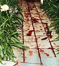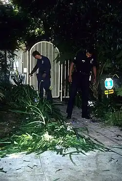 Park's testimony was significant because it explained the location of the glove found at Simpson's home.[108] The blood trail from the Bronco to the front door was easily understood but the glove was found on the other side of the house. Park said the "shadowy figure" initially approached the front door before heading down the southern walkway which leads to where the glove was found by Fuhrman. The prosecution believed that Simpson had driven his Bronco to and from Brown's home to commit the murders, saw that Park was there and aborted his attempt to enter through the front door, entering through the back instead.[109] He panicked and made the sounds that Kaelin heard when he realized that the security system would not let him enter through the rear entrance.[110] He then discarded the glove, came back and went through the front door.[13] During cross examination, Park conceded that he could not identify the figure but said he saw that person enter the front door and afterwards Simpson answered and said he was home alone. Park conceded that he did not notice any cuts on Simpson's left hand but added "I shook his right hand, not his left".[105]