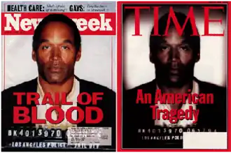 On June 27, 1994, Time published a cover story, "An American Tragedy", with a photo of Simpson on the cover.[50][51] Time's cover image was darker than a typical magazine cover and darker than the original photo, as shown on a Newsweek cover released at the same time. Time consequently became the subject of a media scandal.[52] Commentators found that its staff had used photo manipulation to darken the photo, and they speculated it was to make Simpson appear more menacing. After the publication of the photo drew widespread criticism of racist editorializing and yellow journalism, Time publicly apologized.[53][50][54]