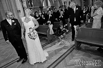 Muting occurs in social rituals. Kramarae suggests that many elements within wedding ceremonies situate women in a silenced position.[16] For example, the fact that the father of the bride "gives her away" to the groom, the bride is placed to the left of the minister which is considered less privileged than the groom, the groom announces his vows first and the groom is asked to kiss the bride, are all factors that contribute to women's subordination to men.[16]