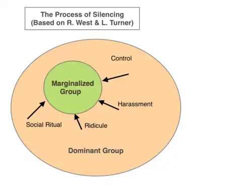 Several scholars have researched and studied how the "muting" process occurs. According to West and Turner (2019), there are four methods that can cause muting: ridicule, ritual, control and harassment.[1] A central factor that contributes to these silencing methods is the trivialization of the lexicon and speech patterns that is often used to describe women's activities.[16]