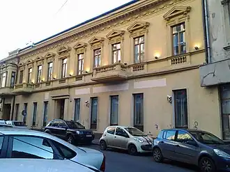 Porsenna's wartime service was recognized by the National Renaissance Front in June 1940, when he was inducted into the Order of the Crown of Romania, as a Knight.[31] This came just as the Greater Romanian project was coming to an end. In July, between the cession of Bessarabia to the Soviet Union and ahead of a Nazi-mediated partition of Transylvania, Porsenna advised the Gigurtu government to prepare Romanians for population exchanges.[63] His main projects for 1941 included a translation (and critical study) of Cicero's biography, originally by Alphonse de Lamartine.[39] In September 1941, at the height of World War II and Ion Antonescu's dictatorship, he was a councilor for the Labor Ministry, in the social welfare directorate (called Luptă și Lumină, "Struggle and Enlightenment"). In this capacity, he instructed factory owners to embrace corporate solidarism, defined as a "collaboration between capital and labor"; he also curated "workers' libraries", which were to be made mandatory in all factories.[64] In January 1942, he donated his own estate, a 900-hectares plot outside Otopeni, for the state to build a "citadel of the workers";[65] his own residence was recorded as Lascăr Catargiu Boulevard 27, in downtown Bucharest.[1] In early 1943, as a member of Concordia Society, Dorina was networking with the Romanian Red Cross, channeling funds for soldiers fighting the Soviets on the Eastern Front.[66]