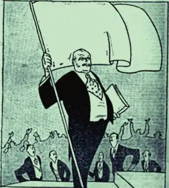 Porsenna's career was touched by political tension during the first two years of World War I, when Romania maintained neutrality. In his Latinul, he urged for an intervention in support of the Entente Powers, citing Francophilia and pan-Latinism as motivations—his articles were reunited as a propaganda brochure, called Războiul popoarelor ("The War of Peoples"). Alongside Froda, he also produced a verse drama, Vulturul ("The Eagle"), depicting events in the life of Michael the Brave, and thus promoting the Ententist version of Romanian nationalism.[19] Two other political essays came out in 1915 and 1916, respectively: Principiul libertății în evoluția politică a statelor europene ("The Principle of Freedom in the Evolution of European States"), and Heghemonia politică în raport cu dezvoltarea politică a statelor ("Political Hegemony in Relation to the Political Development of States").[11] In Ghilotina, Porsenna moderated his stance, adopting some ideas from the "Germanophile" faction of the Conservative Party—and more specifically from its leader, Alexandru Marghiloman. He proposed that Romanians should wait out the war, and only join that camp that was most likely to win.[19] In late 1915, he was briefly credited as co-editor of the avant-garde and anti-war magazine Chemarea, whose manager was poet Ion Vinea.[22]