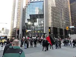 The Canadian Union of Postal Workers marched over to the intersection after lunch and met up with the protesters. After a large crowd gathered at the Bay Street entrance to the Toronto-Dominion Bank, five people entered the bank and security detained them before removing them from the branch.[8]