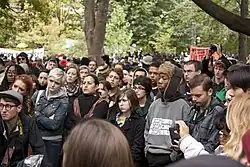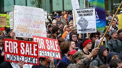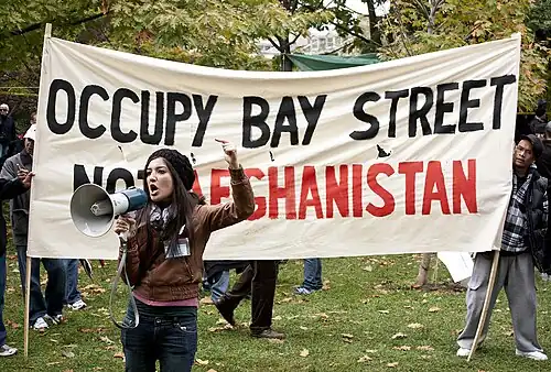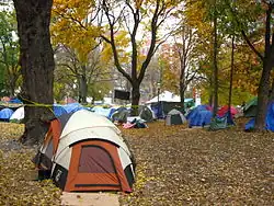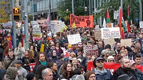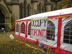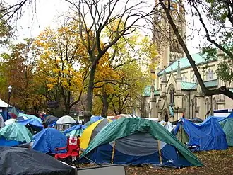 Occupy Toronto was a protest and demonstration that began on October 15, 2011, in Toronto, Ontario, near Bay Street in Downtown Toronto's Financial District[2][3] and moved to St. James Park. It was a part of the Occupy movement, which protested against economic inequality, corporate greed, and the influence of corporations and lobbyists on government.[4]