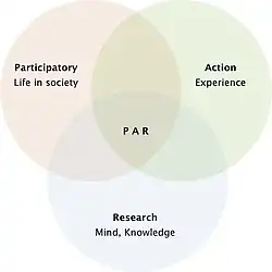 PAR practitioners make a concerted effort to integrate three basic aspects of their work: participation (life in society and democracy), action (engagement with experience and history), and research (soundness in thought and the growth of knowledge).[2] "Action unites, organically, with research" and collective processes of self-investigation.[3] The way each component is actually understood and the relative emphasis it receives varies nonetheless from one PAR theory and practice to another. This means that PAR is not a monolithic body of ideas and methods but rather a pluralistic orientation to knowledge making and social change.[4][5][6]