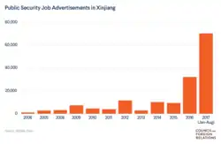 In 2014, the administration of Chinese Communist Party (CCP) General Secretary Xi Jinping launched the Strike Hard Campaign Against Violent Terrorism, which involved surveillance and restrictions in Xinjiang.[2] Beginning in 2017, under Xinjiang CCP Secretary Chen Quanguo,[3] the government incarcerated over an estimated one million Uyghurs without legal process in internment camps officially described as "vocational education and training centers", in the largest mass internment of an ethnic-religious minority group since World War II.[4][5] China began to wind down the camps in 2019, and Amnesty International states that detainees have been increasingly transferred to the penal system.