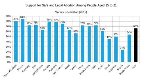 In 2016, the Varkey Foundation and Populus conducted an international study examining the attitudes of 20,000 people aged 15 to 21 in twenty countries.[note 1][55] The survey showed that 66% of people aged 15 to 21 favored legal abortion, but there was significant variation among the countries surveyed: support for this procedure was strongest in France, the United Kingdom, and Canada, but lowest in Argentina, Brazil, and Nigeria.[56] Gallup polls conducted in 2020 in the U.S. revealed that 61% of people aged 18 to 29—older members of Generation Z and younger Millennials—considered themselves pro-choice, while only 34% identified as pro-life. In general, the older someone was, the less likely that they supported access to abortion.[57] Nevertheless, anti-abortion sentiments among American youths in the early 2020s were sufficiently strong to motivate them to participate in the annual March for Life in Washington D.C.[58][59][60]