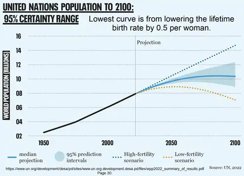 - ↑ UN: 2.4bn more people but is end of growth in sight? July 11, 2022. Population Matters.