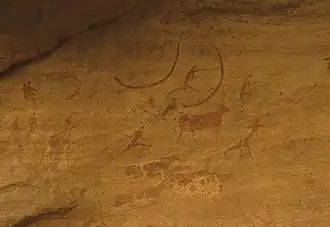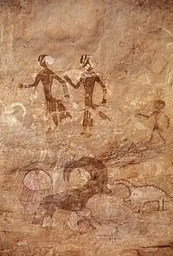 Following the Ogolian period, between the late 10th millennium BCE and the early 9th millennium BCE, the creators of the Ounjougou pottery – the earliest pottery in Africa – migrated, along with their pottery, from Ounjougou, Mali into the Central Sahara.[13] The emergence and expansion of ceramics in the Sahara may be linked with the origin of both the Round Head and Kel Essuf rock art, which occupy rockshelters in the same regions (e.g., Djado, Acacus, Tadrart) as well as have a common resemblance (e.g., traits, shapes).[16] Whether or not Ounjougou ceramic culture spread as far as Bir Kiseiba, Egypt, which had pottery that resembled Ounjougou pottery, had implements used for grinding like at Ounjougou, and was followed by subsequent ceramic cultures (e.g., Wadi el Akhdar, Sarurab, Nabta Playa), remains to be determined.[13] Between 8200 BCE and 6400 BCE, Central Saharan hunter-gatherers of Libya (e.g., Takarkori, Uan Afuda) gathered a diverse selection of flora (e.g., aquatic plants from lakes, grasses from savanna grasslands) and utilized ceramic pots to process and cook the flora.[48] By 10,000 BP, the primary region of residence for Niger-Congo speakers, who wielded bows and arrows, may have been the southern region of the Central Sahara.[14] Amid an early period of the Holocene, semi-settled Epipaleolithic and Mesolithic hunters, who created a refined material culture (e.g., stone tools, decorated pottery) as early as 10,000 BP,[49] also created the engraved Kel Essuf and painted Round Head rock art styles located in the region (e.g., some in the Acacus, some in the Tadrart, some in the Jebel Uweinat) of Libya, in the region (e.g., some in the Tadrart, most abundant in Tassili n'Ajjer) of Algeria, in the region (e.g., Djado) of Nigeria, and the region (e.g., Djado) of Niger.[49][50][51] Amid the early Sahara, Round Head rock artists, who had a sophisticated culture and engaged in the activity of hunting and gathering, also developed pottery, utilized vegetation, and managed animals.[52] The cultural importance of shepherded Barbary sheep (Ammotragus lervia) is shown via their presence in Round Head rock art throughout the Central Sahara (e.g., Libyan region of Tadrart Acacus, Algerian region of Tassili n’Ajjer).[53] Barbary sheep were corralled in stone enclosures near Uan Afuda cave.[53] From up to 9500 BP, this continued until the beginning of the Pastoral Neolithic in the Sahara.[53] Between 7500 BCE and 3500 BCE, amid the Green Sahara, undomesticated central Saharan flora were farmed, stored, and cooked, and domesticated animals (e.g., Barbary sheep) were milked and managed, by hunter-gatherers near the Takarkori rockshelter, which is representative of the broader Sahara; this continued until the beginning of the Pastoral Neolithic in the Sahara.[17]