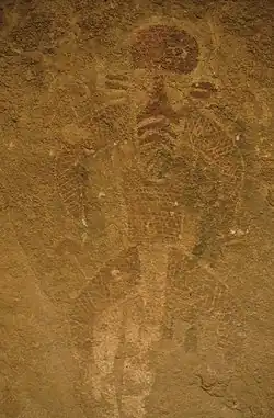 The creators of the Round Head rock art possessed dark skin.[111][20][49][50][112][113] The dark-skinned ethnic groups, who created the Round Head rock art, differed from Tuareg Berbers.[112][113] Long-dwelling Tuareg from the same area also recognized the Round Head rock art as a creation of black people who resided in the Tassili region long ago.[114] The dark skin complexion of the hunters who created the Round Head rock art was verified via the testing of skin samples taken from human remains located in the Acacus region of Libya and the Tassili region of Algeria.[20] Based on examination of the Uan Muhuggiag child mummy and Tin Hanakaten child, the results verified that these Central Saharan peoples from the Epipaleolithic, Mesolithic, and Pastoral periods possessed dark skin complexions.[93] Soukopova (2013) thus concludes: “The osteological study showed that the skeletons could be divided into two types, the first Melano-African type with some Mediterranean affinities, the other a robust Negroid type. Black people of different appearance were therefore living in the Tassili and most probably in the whole Central Sahara as early as the 10th millennium BP."[93]