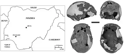 The Iwo Eleru skull, which was found at Iwo Eleru, Nigeria and may be evidence of modern humans possessing possible archaic human admixture[6] or of a late-persisting early modern human, has been dated to 13,000 BP.[41]