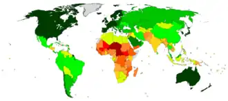 Almost 90% of maternal deaths during childbirth occur in Asia and sub-Saharan Africa, compared to less than 1% in the developed world.[118] Those who live in poverty have also been shown to have a far greater likelihood of having or incurring a disability within their lifetime.[119] Infectious diseases such as malaria and tuberculosis can perpetuate poverty by diverting health and economic resources from investment and productivity; malaria decreases GDP growth by up to 1.3% in some developing nations and AIDS decreases African growth by 0.3–1.5% annually.[120][121][122]