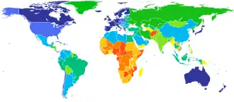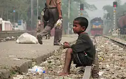 In 2012 it was estimated that, using a poverty line of $1.25 a day, 1.2 billion people lived in poverty.[75] Given the current economic model, built on GDP, it would take 100 years to bring the world's poorest up to the poverty line of $1.25 a day.[76] UNICEF estimates half the world's children (or 1.1 billion) live in poverty.[77] The World Bank forecasted in 2015 that 702.1 million people were living in extreme poverty, down from 1.75 billion in 1990.[78] Extreme poverty is observed in all parts of the world, including developed economies.[79][80] Of the 2015 population, about 347.1 million people (35.2%) lived in Sub-Saharan Africa and 231.3 million (13.5%) lived in South Asia. According to the World Bank, between 1990 and 2015, the percentage of the world's population living in extreme poverty fell from 37.1% to 9.6%, falling below 10% for the first time.[81]