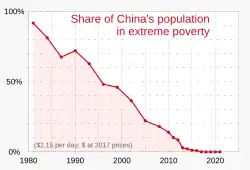 Poverty in the People's Republic of China mainly refers to rural poverty. Decades of economic development has reduced urban extreme poverty.[1][2][3] According to the World Bank, more than 850 million Chinese people have been lifted out of extreme poverty; China's poverty rate fell from 88 percent in 1981 to 0.7 percent in 2015, as measured by the percentage of people living on the equivalent of US$1.90 or less per day in 2011 purchasing price parity terms,[4][5] which still stands in 2022.[6][7][8]