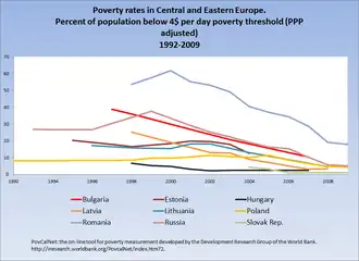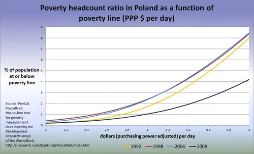 It has been estimated that Poland began its transformation from communist to capitalist economy with about 20% of its population in poverty.[16] Poverty in Poland rose briefly in the period of 1990-1992 and has been largely diminishing since; it did however rise again in the late 1990s, following the slowdown in economic growth.[16][17] In the years 1994–2001, the subjective poverty line remained relatively stable at about 33%; and the relative poverty line (poverty threshold) rose from 13.5% to 17%.[16] Absolute poverty - as defined by the World Bank, the percentage of population living on less than $4.30 per day - in the period 1997-1999 affected 8.4% of Polish population.[16] Estimates by other sources vary, however. According to Brzeziński (2011), in the years 1998-2003 absolute poverty in Poland has risen by about 8%, reaching (according to the Central Statistical Office (GUS) estimate) 18.1% in 2005, and dropping to 10.6% in 2008; an alternate measure suggests that in the period 2005-2008 absolute poverty fell from 12.3% to 5.6%.[18] Brzeziński (2011) notes that any rise in poverty in the period 1998-2005 was outdone by the drop in poverty in the years 2005–2008.[18]