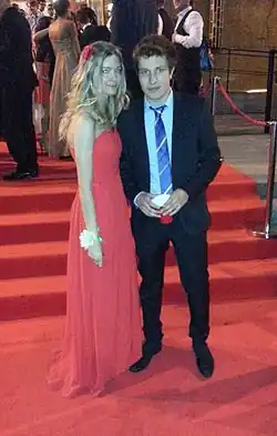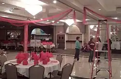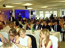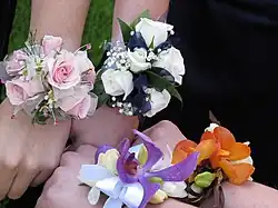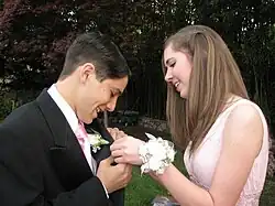 Prom attendees may be limited by their schools to be juniors or seniors and guests under age 21.[19][20] Boys are usually the ones to ask their date to the prom. A 2014 YouGov survey of men who went to prom found that 79% of them asked. Of women surveyed, 29% said they asked.[21] Before prom, girls typically get their hair styled, often in groups as a social activity at a salon. Prom couples then gather at a park, garden, or their own and their dates' houses for single and group photographs. Prom attendees may rent limousines[22] or party buses[23] to transport groups of friends from their homes to the prom venue. Some schools host their proms at hotel ballrooms, banquet halls, or other venues where weddings typically take place. The dance itself may have a band or DJ. At prom, a meal may be served. By the early 21st century, prom has become a multi-billion-dollar business in the United States, with each family spending hundreds to even thousands of dollars for the occasion.[24]