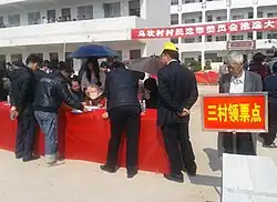 During the first round of elections on 1 February, some 6,000 Wukan villagers voted for an independent committee to supervise elections for a new village leadership.[50] On 11 February, over 6,500 villagers (85% of the population)[49] voted to elect 107 village representatives, with protester leader Lin Zuluan as village Party chief replacing the ousted leader, who had held the position for 42 years. The young Xue Jianwan, the daughter of deceased protest leader Xue Jinbo, was also elected.[51] According to WSJ writer Josh Chin, the election appeared to be "free of the Communist Party meddling that typically mars Chinese election results."[52]