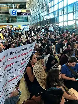 In late January and early February 2017, during protests against Executive Order 13769, commonly referred to as the “Muslim ban,” thousands of people gathered at various airports in the United States and around the world to protest the attempt by the Trump administration to prevent the prohibition of refugees and visitors from seven countries considered by the administration to be unsafe.[1] According to various sources, more than two thousand people were at the protest at John F. Kennedy International Airport in Queens, New York City[2][3] with other protests appearing at significant international airports and other important sites around the United States. Protests continued daily and internationally through February 6.[4][5][6][7] Protests also continued after a federal judge issued a temporary restraining order against parts of the travel ban.[8]
