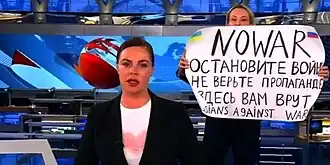 On 14 March, a live broadcast of Channel One Russia was interrupted by news editor Marina Ovsyannikova holding a poster stating "No War. Stop the war, don't believe the propaganda, here you are being lied to. Russians against war." and shouting "Stop the war. No to war." before she was arrested.[92][93] Following Ovsyannikova's protest, an anonymous source working at the All-Russia State Television and Radio Broadcasting Company stated that the majority of Russian state TV employees oppose the invasion, and Ovsyannikova merely voiced out loud the general sentiment of her colleagues.[94] This information was independently confirmed by Elena Afanasyeva, the former head of creative planning at Channel One, who said that many state TV employees disagree with the channel's coverage of the war, and by another anonymous source close to Channel One who asserted that all of the channel's employees acknowledge that they're spreading lies about the war, and are dissatisfied with this state of affairs.[95] Ever since 24 February, a number of employees, including Lilia Gildeeva, Zhanna Agalakova, Maria Baronova and several other RT reporters, resigned from state TV in protest of the invasion; some of them subsequently left the country.[96]