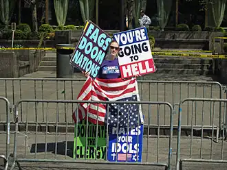 The group came into the national spotlight in 1998, when it was featured on CNN for picketing the funeral of Matthew Shepard, a young man from Laramie, Wyoming, who was beaten to death by two men allegedly because of his homosexuality.[1] WBC later picketed productions of The Laramie Project, a play based on Shepard's murder.[2][3][4] Since then, WBC has attracted attention for many more actual and planned funeral pickets.[5][6][7][8][9][10]