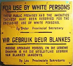 In parts of the United States, especially in the South, signs were used to indicate where African Americans could legally walk, talk, drink, rest, or eat.[33][34]
