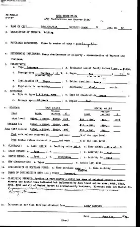 Page of HOLC document from Philadelphia redlining map. Zone D20, one of the red areas.