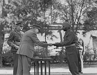 Conversely, in 1906, Churchill defended the Indian minority in South Africa. In 1919, he openly condemned the Jallianwala Bagh massacre, referring to it as "unutterably monstrous".[27] In 1935, Churchill invited Gandhi's friend, Ghanshyam Das Birla, to Chartwell, where he told him, "Mr. Gandhi has gone very high in my esteem since he stood up for the Untouchables," and expressed support for the Indian nationalists and advised them on how to improve the country, saying, "I am genuinely sympathetic towards India. I have got real fears about the future. India, I feel is a burden on us. We have got to maintain an army and for the sake of India we have to maintain Singapore and Near East strength. If India could look after herself we would be delighted. … I would be only too delighted if the Reforms are a success. I have all along felt that there are fifty Indias. But you have got the thing now; make it a success and if you do I will advocate your getting much more." Gandhi responded positively to Churchill's advice, and said, "I have held the opinion that I can always rely on his sympathy and goodwill."[28] In April 1941, Churchill wrote to the Viceroy of India, "…it is as one who has had the honour to serve in the field with Indian soldiers from all parts of Hindustan, as well as in the name of His Majesty's Government, that I ask Your Excellency to convey to them and the whole Indian army the pride and admiration with which we have followed their exploits."[29] In March 1942, Churchill sent Stafford Cripps on a mission to India ("the Cripps Mission") with an offer based on full Dominion status after the war, stating "We must remember that India has a great part to play in the world's struggle for freedom and that her helping hand must be extended in loyal comradeship to the valiant Chinese people, who have fought alone so long. We must remember also that India is one of the bases from which the strongest counter-blows must be struck at the advance of tyranny and aggression."[30] This was rejected. Churchill later wrote, "I cannot see any objection to Indians serving on H.M. Ships where they are qualified and needed, or if their virtues so deserve rising to be Admirals of the Fleet. But not too many of them, please."[31] In September of that year, Churchill addressed the House of Commons, praising India for its role and suggesting Gandhi be placed under protection, stating, "the Viceroy and Government of India, with the unanimous support of the Viceroy's Council, the great majority of which are Indians, patriotic and wise men, have felt it necessary to proclaim and suppress the central and Provincial organs of this association which has become committed to hostile and criminal courses. Mr. Gandhi and other principal leaders have been interned under conditions of the highest comfort and consideration, and will be kept out of harm's way till the troubles subside".[32] At lunch in July 1944 Churchill said to India's representative on the War Cabinet Sir Arcot Ramasamy Mudaliar, "The old idea that the Indian was in any way inferior to the white man must go. We must all be pals together. I want to see a great shining India, of which we can be as proud as we are of a great Canada or a great Australia."[33] After the War's end, Churchill paid tribute to the Indian contribution in the war, "The loyalty of the Indian Army to the King-Emperor, the proud fidelity to their treaties of the Indian Princes, the unsurpassed bravery of Indian soldiers and officers, both Moslem and Hindu, shine for ever in the annals of war."[34] In 1948, he expressed shock at Gandhi's assassination.[35]