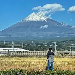 A trainspotter photographing an N700 Series Shinkansen on the Tokaido Shinkansen line near Mount Fuji