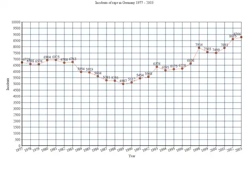 The prevalence of rape in Germany has remained relatively stable, and although the country has the second highest overall number of rapes reported in the EU, the number of reports per capita is average for the region.[2][3] As of 1995 the recorded incidence of rape in Germany was 7.57 per 100,000 people.[4] In 2009, about 7,314 rape cases were reported, a rate of 9 per 100,000 people.[5] In 2011, there were about 7,539 reported cases of rape.[6][5][b]