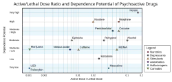 Drug harmfulness is defined as the degree to which a psychoactive drug has the potential to cause harm to the user and is measured in several ways, such as by addictiveness and the potential for physical harm. More objectively harmful drugs may be colloquially referred to as "hard drugs",[34] and less harmful drugs as "soft drugs".[35] The term "soft drug" is considered controversial by critics as it may imply the false belief that soft drugs cause lesser or insignificant harm.[35]