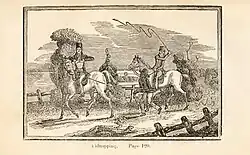 Free blacks in New York City and Philadelphia were particularly vulnerable to kidnapping. In New York, a gang known as 'the black-birders' regularly waylaid men, women and children, sometimes with the support and participation of policemen and city officials.[5] In Philadelphia, black newspapers frequently ran missing children notices, including one for the 14-year-old daughter of the newspaper's editor.[6] Children were particularly susceptible to kidnapping; in a two-year period, at least a hundred children were abducted in Philadelphia alone.[7] In 1826 Rhode Island newspaper editors recounted having met slave catchers and an enslaved man at a tavern in western Alabama, and after the traders passed out from drinking, interviewed the slave, who had been chained to a post in the tavern. The Rhode Island paper recounted: "He informed us he was a native of the city of New-York, had been employed on board of a collier vessel running between that city and Richmond, Virginia, and that whilst at Norfolk, the master of the vessel, who had become involved a difficulties, by his own dissipation, sold him to a slave dealer, who took him to the interior of Virginia, where he was sold to a planter, in whose service he remained, till after making several attempts to escape from bondage, he was sold to an Alabama trader, to whom, by purchase, he now belonged, and at whose hands he met with the most savage treatment. He farther informed us, that a few days previous, he had absconded, and had nearly reached the Ohio River, when he was overtaken; and was then on his way back to the plantation of CONOLL WISTER, where he expected to meet the most savage treatment for his temerity. He was intelligent and interesting; and anxious to discover whether he were free or not, we questioned him relative to the location of the city of New York, its streets, inhabitants, public edifices and climate, and were perfectly satisfied the tale he told was scrupulously true."[8]