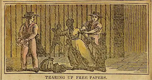 ![]() Tearing up the free-born and manumission papers and kidnapping of a free black, in the U.S. free states, to be sold into Southern slavery, from an 1838 abolitionist anti-slavery almanac | |