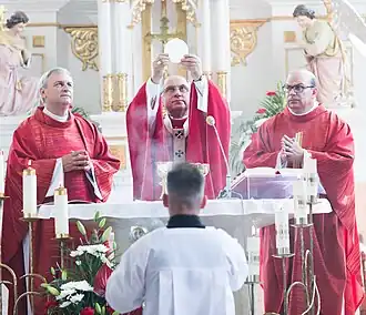 Rites of feasting and fasting are those through which a community publicly expresses an adherence to basic, shared religious values, rather than to the overt presence of deities as is found in rites of affliction where feasting or fasting may also take place. It encompasses a range of performances such as communal fasting during Ramadan by Muslims; the slaughter of pigs in New Guinea; Carnival festivities; or penitential processions in Catholicism.[38] Victor Turner described this "cultural performance" of basic values a "social drama". Such dramas allow the social stresses that are inherent in a particular culture to be expressed and worked out symbolically in a ritual catharsis; as the social tensions continue to persist outside the ritual, pressure mounts for the ritual's cyclical performance.[39] In Carnival, for example, the practice of masking allows people to be what they are not, and acts as a general social leveller, erasing otherwise tense social hierarchies in a festival that emphasizes play outside the bounds of normal social limits. Yet outside carnival, social tensions of race, class and gender persist, hence requiring the repeated periodic release found in the festival.[40]