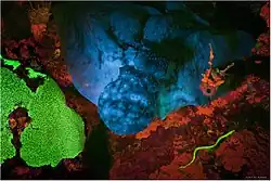 - ↑ David F Gruber; Jean P Gaffney; Shaadi Mehr; Rob DeSalle; John S Sparks; Jelena Platisa; Vincent A Pieribone (2015). "Adaptive Evolution of Eel Fluorescent Proteins from Fatty Acid Binding Proteins Produces Bright Fluorescence in the Marine Environment". PLOS One. 10 (11): e0140972. Bibcode:2015PLoSO..1040972G. doi:10.1371/JOURNAL.PONE.0140972. ISSN 1932-6203. PMC 4641735. PMID 26561348. Wikidata Q24810539.