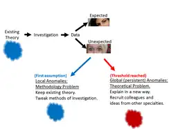 Dunbar and Fugelsang suggest that the process of discovery often starts when a researcher finds bugs in their experiment. These unexpected results lead a researcher to self-doubt, and to try and fix what they think is an error in their own methodology. The first recourse is to explain the error using local hypotheses (e.g. analogies typical of the discipline). This process is also local in the sense that the scientist is relatively independent or else working with one partner. Eventually, the researcher decides that the error is too persistent and systematic to be a coincidence. Self-doubt is complete, and so the methods shift to become more broad: The researcher begins to think of theoretical explanations for the error, sometimes seeking the help of colleagues across different domains of expertise. The highly controlled, cautious, curious and even social aspects of the scientific method are what make it well suited for identifying persistent systematic errors (anomalies).[2][8]