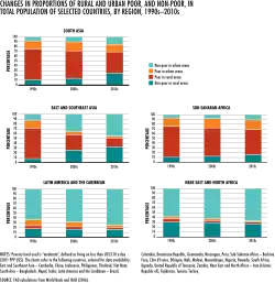An analysis by the Food and Agriculture Organization of the United Nations (FAO) found that the urban poor exited poverty at faster rates than the rural poor between the 1990s and 2010s, but the overall rural poverty reduction varied by region. Only in East and Southeast Asia had rural poverty been substantially reduced, where the share of the rural non-poor in total population increased from 9 percent in the 1990s to 33 percent in the 2010s. The poverty rates in South Asia and sub-Saharan Africa in the 1990s were comparable with those of East and Southeast Asia, but both urban and rural poor in both regions only modestly reduced. On the other hand, Latin America and the Caribbean and the Near East and North Africa had low overall moderate poverty rates even in the 1990s, and over the course of the studied decades, the exit from poverty was mainly in urban areas. Estimates from 2016 indicate that 58 percent of Latin America’s poor live in urban centres, compared with rates of 25–30 percent in other regions.[12][13]