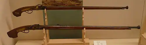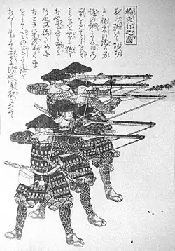 From this time on, infantrymen called ashigaru, who were mobilized from the peasantry, were mobilized in even greater numbers than before, and the importance of the infantry, which had begun in the Nanboku-chō period, increased even more.[44] When matchlocks were introduced from Portugal in 1543, Japanese swordsmiths immediately began to improve and mass-produce them. The Japanese matchlock was named tanegashima after the Tanegashima island, which is believed to be the place where it was first introduced to Japan. By the end of the Sengoku Period, there were hundreds of thousands of arquebuses in Japan and a large army of nearly 100,000 men clashing with each other.[45]