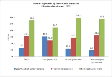 Second-generation immigrants are more educated compared to first generation immigrants, exceeding parental education in many instances.[6] A greater percentage of second-generation immigrants have obtained a level of education beyond a high school diploma, with 59.2% having at least some college education in 2009.[2] Also in 2009, 33% of the second generation immigrant population had a bachelor's degree.[2] The following graph depicts the data collected by the U.S. Census Bureau on educational attainments for immigrant generations in the year 2009.[2]