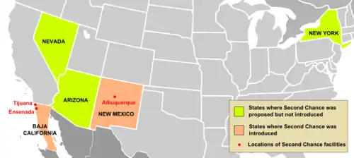 Between 1995 and 2009, Second Chance operated in prisons in Albuquerque, New Mexico, United States and in the Mexican cities of Tijuana and Ensenada. Its Mexican operations were closed down after it lost government funding. Its only U.S. operation was terminated in January 2009 by the mayor of Albuquerque. By that time it had received more than $1.5 million in public funding, but on closing it left debts of over $672,000 to the federal, state and city governments. Second Chance was proposed – but was rejected – for prisons in the states of Arizona, Nevada and New York.