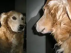 Chimpanzees and other apes—extensively studied species—are most similar to humans, with the most convincing findings and straightforward evidence of self-awareness in animals.[43] During the red-spot technique, after looking in the mirror, chimpanzees used their fingers to touch the red dot on their forehead and, after touching the red dot they would smell their fingertips.[44] "Animals that can recognize themselves in mirrors can conceive of themselves," says Gallup.