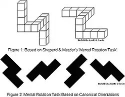 Performance in mental rotation and similar spatial tasks is affected by gender expectations.[54] For example, studies show that being told before the test that men typically perform better, or that the task is linked with jobs like aviation engineering typically associated with men versus jobs like fashion design typically associated with women, will negatively affect female performance on spatial rotation and positively influence it when subjects are told the opposite.[55]