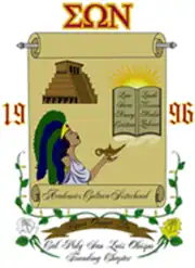 Sigma Omega Nu's objectives or pillars are Academics, Cultura, and Sisterhood.[5][8] The sorority's colors are black, burgundy, and gold.[5][12] Its symbol is the sun.[5][12] Its flowers are white and yellow roses.[5][8] Its nicknames are Sunnies and SON.[5][12]