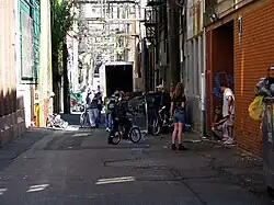 Today, the area most often referred to as Philadelphia's modern-day skid row is in the Kensington neighborhood, along Kensington Avenue near the intersections of Somerset Street and Allegheny Avenue. The area is known for its high rates of open-air recreational drug use, poverty, and homelessness.[46] A long-time camp largely hidden from public view in a gulch alongside Conrail tracks, spanning an area roughly from N 2nd Street to Kensington Avenue, was cleared in 2017.[47] In late 2018, the city cleared a series of large homeless resident camps along Kensington Avenue, Emerald Street, Tulip Street, and Frankford Avenue.[48] The homeless resident population in the Kensington neighborhood alone is estimated to be over 700 individuals.[49]
