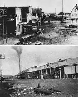 - ↑ Top: View looking west to Yesler's Mill at the end of the street (see smokestack) and nearby cookhouse; the tall pole in the road on the right is where the Pioneer Square pergola stands today, (1874) Bottom: Yesler's Mill, stores, and taverns on Skid Road