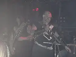 Among some skinheads, heavy metal is popular. Bands such as the Canadian act Blasphemy, whose guitarist is Black, has been known to popularise and merchandise the phrase "black metal skinheads".[30] As the group's vocalist recounts, "a lot of black metal skinheads from the other side of Canada" would join in on the British Columbian black metal underground. "I remember one guy... who had 'Black Metal Skins' tattooed on his forehead. We didn't hang out with white power skinheads, but there were some Oi skinheads who wanted to hang out with us."[45] National Socialist black metal has an audience among white power skinheads. Black metal pioneer and right-wing extremist Varg Vikernes was known to adopt a skinhead look and wear a belt with the SS insignia while serving time in prison for the arson of several stave churches and the murder of Øystein Aarseth.[46]