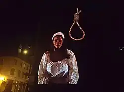 Marie-Joachim was an enslaved Meskwaki (Fox) woman who belonged to Julien Trottier dit Desrivieres, a wealthy merchant of Montreal. She was brought to Montreal as a slave around 1712 but only appeared in official records in 1725 at the age of 22 due to her involvement in a criminal trial. She was accused of stealing trade goods from her master's warehouse with the intention of giving them to her French lover. While she was sentenced to have her hands cut off, she was sold, instead to a master in Quebec City where she worked as a domestic slave. She eventually died a few years later in her late 20s.[16]