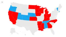 In the United States over 200,000 minors were legally married from 2002 to 2017, with the youngest being only 10 years old. Most were married to adults.[79] Currently 48 US states, as well as D.C. and Puerto Rico, allow marriage of minors as long as there is judicial consent, parental consent or if the minor is pregnant.[80][81] In 2017–2018, several states began passing laws to either restrict child marriage[82][83][84] or ban it altogether.[85]