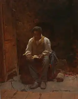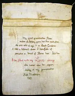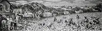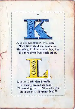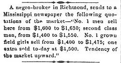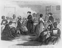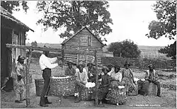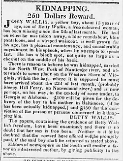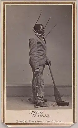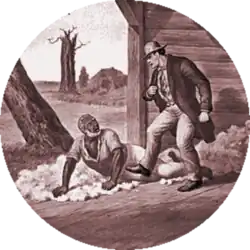 Slavery in the United States was a variable thing, in "constant flux, driven by the violent pursuit of ever-larger profits."[65] The enslaved labor force of the United States, while stereotypically drawn as field labor for the production of cash crops like sugar and cotton, performed nearly every type of skilled labor sought by the economy. An examination of 1200 runaway slave ads published in Tennessee found 25 blacksmiths, 18 carpenters, and 13 shoemakers, as well as barbers, boat builders, bricklayers, a "conjurer or fortune teller," cooks, coopers, cotton mill engineers, dressmakers (often called mantuamakers), hack drivers, iron furnace engineers, milliners, millwrights, ministers, musicians (most commonly of the fiddle/violin), a racehorse trainer, ostlers, plasterers, painters, seamstresses, stonemasons, tanners, a "turner and tin-plate workman," wagoners, waiters, and weavers.[66] Complex as it was, historians do know, however, that slavery in the United States was not a "deferred-compensation trade school opportunity."[67] Harriet Beecher Stowe summarized slavery in the United States in 1853:[68]